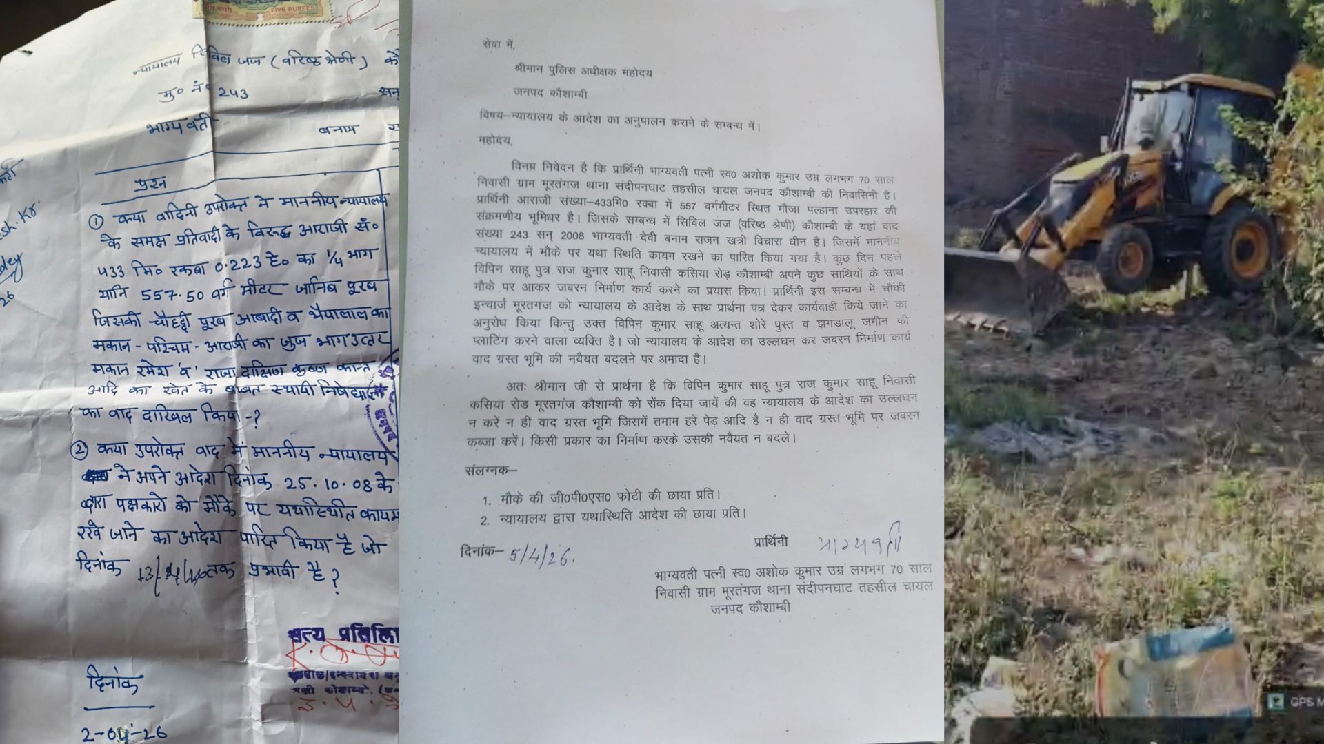 कौशाम्बी के संदीपन घाट थाना क्षेत्र के मूरतगंज में एक विवादित भूमि को लेकर तनाव बढ़ गया है। यह जमीन भाग्यवती पत्नी स्व. अशोक कुमार की बताई जा रही है। आरोप है कि विपिन साहू ने JCB मशीन से भूमि पर जबरन कब्जा करने का प्रयास किया और अवैध निर्माण शुरू कर दिया। घटना के समय पीड़ित मौके पर पहुंचकर अवैध निर्माण का विरोध किया, पीड़ित महिला भाग्यवती ने एसपी को शिकायत पत्र देकर न्याय की गुहार लगाई थी.उन्होंने अपनी शिकायत में साफ कहा कि जमीन पर कब्जा न्यायालय के आदेश का उल्लंघन है और इसे रोकने के लिए प्रशासन को तुरंत कदम उठाने चाहिए। पीड़ित का आरोप है कि प्रशासन और पुलिस इस मामले में निष्क्रिय रही। उनका कहना है कि मामले की जानकारी होने के बावजूद मौके पर समय रहते कोई कार्रवाई नहीं हुई, जिससे तनाव और बढ़ गया। कई लोगों का यह भी सवाल है कि क्या दबाव या राजनीतिक प्रभाव की वजह से जिम्मेदार अधिकारी कार्रवाई में देरी कर रहे हैं। यह घटना सिर्फ जमीन के विवाद तक सीमित नहीं है। यह प्रशासनिक जवाबदेही और कानून के पालन पर गंभीर सवाल उठाती है। पीड़ित महिला ने एसपी को लिखित शिकायत देकर न्यायालय के आदेश का पालन सुनिश्चित करने और किसी भी प्रकार की अवैध कब्जेदारी पर तुरंत रोक लगाने की मांग की है। स्थानीय प्रशासन और पुलिस की देरी ने विवाद को और भड़काया है। अब लोगों की निगाहें उन पर हैं कि आखिर वे कब और कैसे कानून के मुताबिक कार्रवाई करेंगे। कौशाम्बी का यह मामला यह दर्शाता है कि अवैध कब्जा और न्यायालय के आदेश की अवहेलना समय रहते न रोकी जाए, तो समाज में असुरक्षा और तनाव बढ़ सकता है। जिम्मेदार अधिकारियों की सक्रियता और जवाबदेही अब सबसे बड़ा सवाल बन चुकी है। Post navigation सियासत में एंट्री का सिग्नल! शालिनी सिंह के बयान से यूपी राजनीति में हलचल